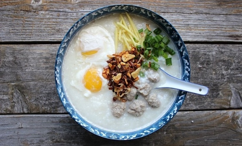 Jok - một loại cháo tương tự như Khao Tom - nhưng được nấu cùng thịt lợn xay hoặc thịt gà. Thịt được hầm cùng gạo và nước luộc gà cho đến khi mềm và có hương vị. Người Thái cũng thích thưởng thức món Jok cùng các loại gia vị như nước tương, gừng, hành lá, ngò và đôi khi là một thanh bột chiên. Ảnh: Fearless Eating.